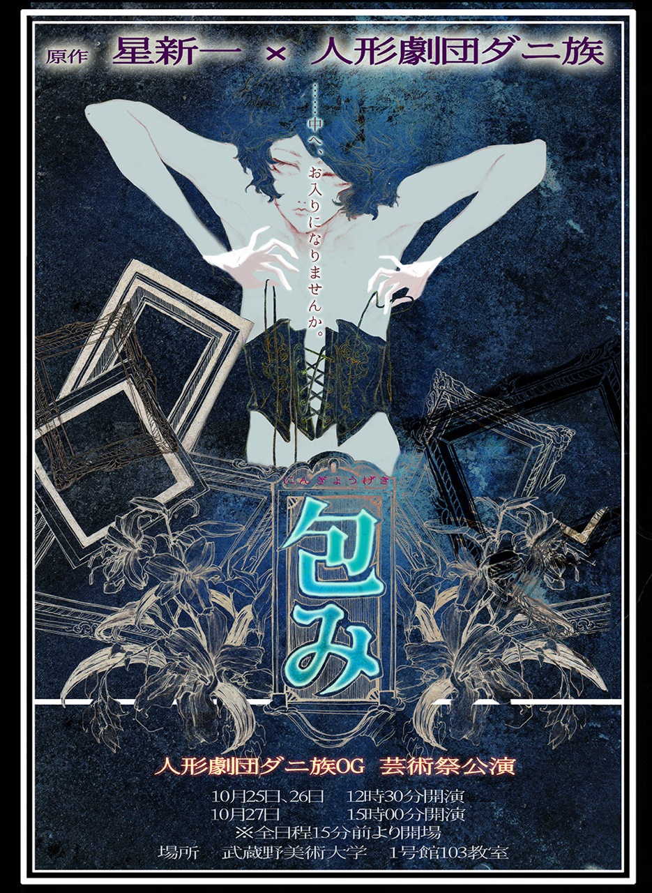 - 10月25日〜27日、武蔵野美術大学芸術祭にておこなわれる「人形劇団ダニ族 芸術祭公演」にて「包み」の人形劇があります。表紙ギャラリーにポスターを掲載しました。