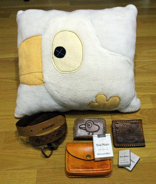 下の写真は友人が、星ファンということで作ってくれた「ほしづるクッション」「ベルトポーチ」「ベルト」「財布」です。