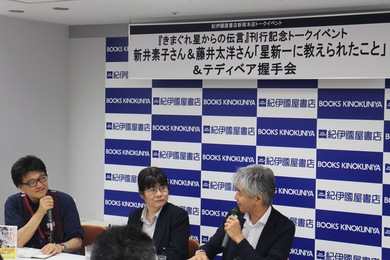 プロジェクト 生誕90周年 トークイベント&テディベア握手会2016年9月18日、紀伊國屋書店・新宿本店において、『きまぐれ星からの伝言』刊行記念のトークイベント「星新一に教えられたこと」と、テディベア握手会を開催しました。 『きまぐれ星からの伝言』カバー写真:新潮社 イラストと題字:YOUCHAN 星新一の生誕90周年を記念して、徳間書店より刊行されたバラエティブックです。 エッセイ、ショートショート、翻訳、インタビュー、講演、対談、お便り、アイデアメモなど。 これまで単行本未収録だったものも、たくさん収録しています。 小松左京さん、筒井康隆さんとの「奇想天外SF新人賞選考会」全3回も収録。 <解説寄稿者> トークイベント「星新一に教えられたこと」SF作家とSF評論家の3名に、星新一の思い出などを語っていただきました。 <登壇者>